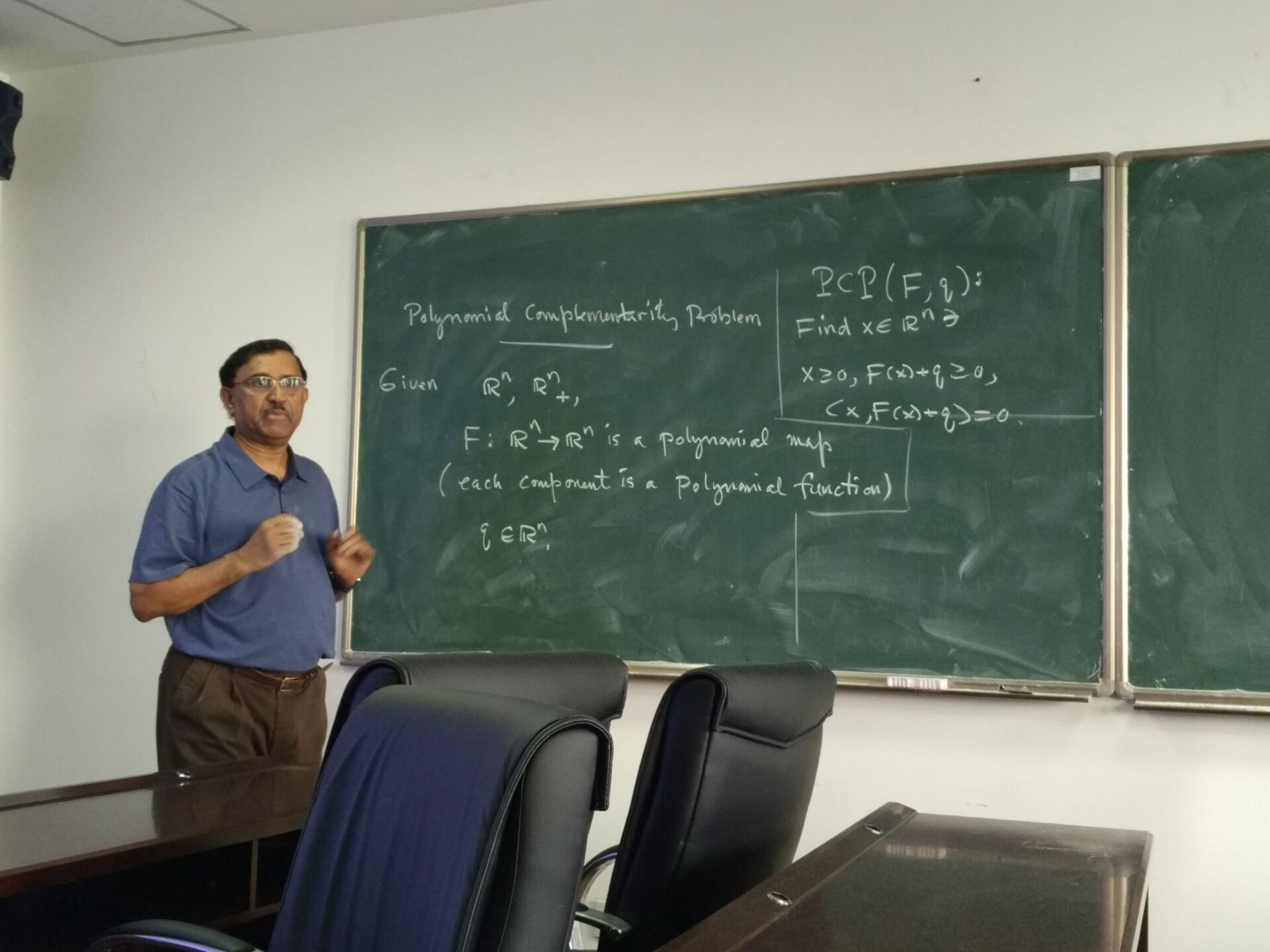 Gowda教授首先简单回顾了线性互补问题的理论、算法和应用。接着,他重点讲解了多项式互补问题和张量互补问题的理论和模型,并指出张量互补问题是多项式互补问题的特例。最后,Gowda教授介绍了他近期在多项式互补问题研究上所取得的最新成果。Gowda教授高深的学术造诣和平易近人的人格魅力感染着在场的每位师生。整个报告过程中,他坚持使用板书,讲解言简意赅,充满激情,让我们真正领略到了为人师,为学者的大家风范。
