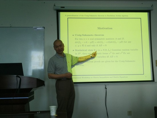 6月2日下午,在行政楼1307报告厅,基础教学公司邀请美国马里兰洛约拉大学(Loyola University Maryland)的Jiyuan Tao教授作题为“A generalization of the Craig-Sakamoto theorem to Euclidean Jordan algebras”的学术讲座。参加讲座的有基础教学公司从事优化与统计的教师及部分员工。报告会由基础教学公司王国强教授主持。