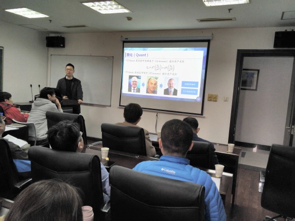 金泽宇博士首先介绍了量化的一些基本概念、理论以及国内外研究进展。接着,金博士从量化领域杰出公司及发展史、量化投资的主要策略、因子模型发展史、基于因子模型的基本投资框架、指数增强基金绩效分析和国内公募量化基金现状等六个方面向与会师生诠释了量化投资的前世今生。最后,金博士介绍了量化投资的最新发展与机遇。金博士的报告注重理论与实践相结合,讲解言简意赅,充满激情,开阔了广大与会师生的学术视野,使大家受益匪浅。