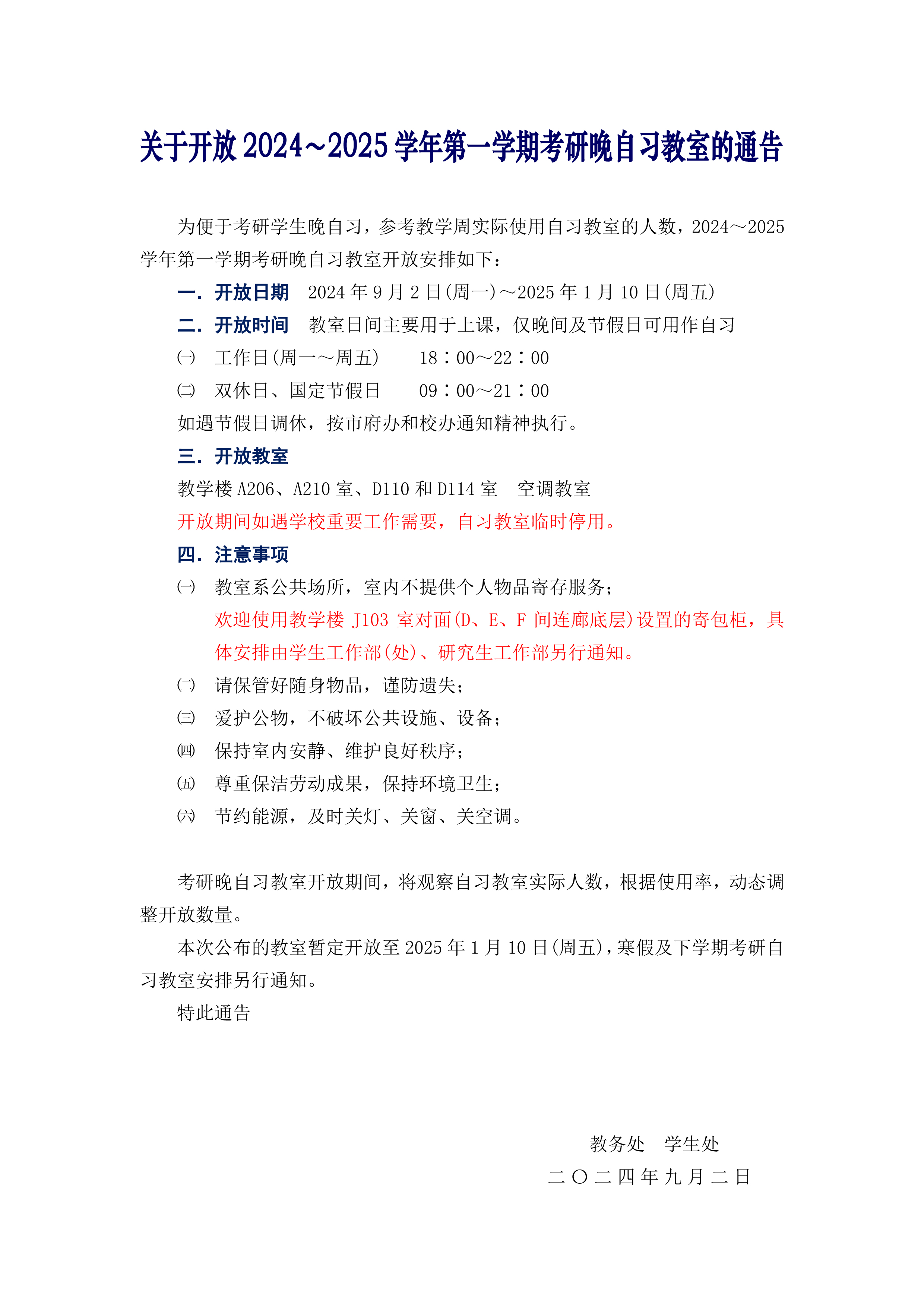关于开放2024~2025学年第一学期考研晚自习教室的通告