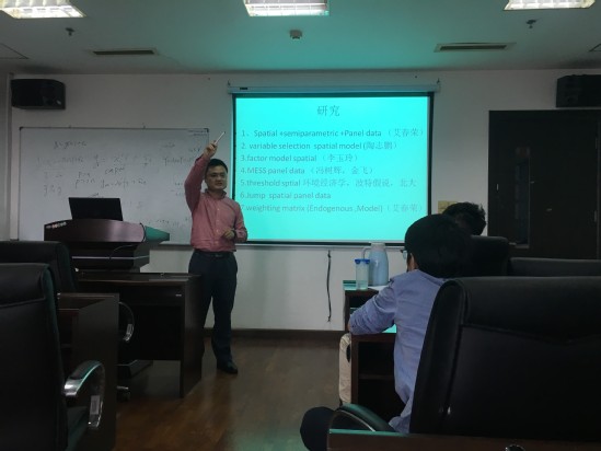 张元庆博士首先综述了空间面板数据模型理论的国内外研究进展。其次,张博士详细讲解与他的合作者在半参数空间面板数据模型理论及其应用方面的研究成果。接着,介绍了空间模型理论在金融方面的应用。最后,张博士对空间理论模型的进一步研究做了展望。张博士的报告内容翔实,讲解深入浅出,给与会师生带来了空间面板数据模型理论的前沿和热点问题,开阔了大家的学术视野。报告结束后,张博士与参加讲座的青年教师和研究生就空间计量经济学理论中的热门话题做了深入的交流与探讨。