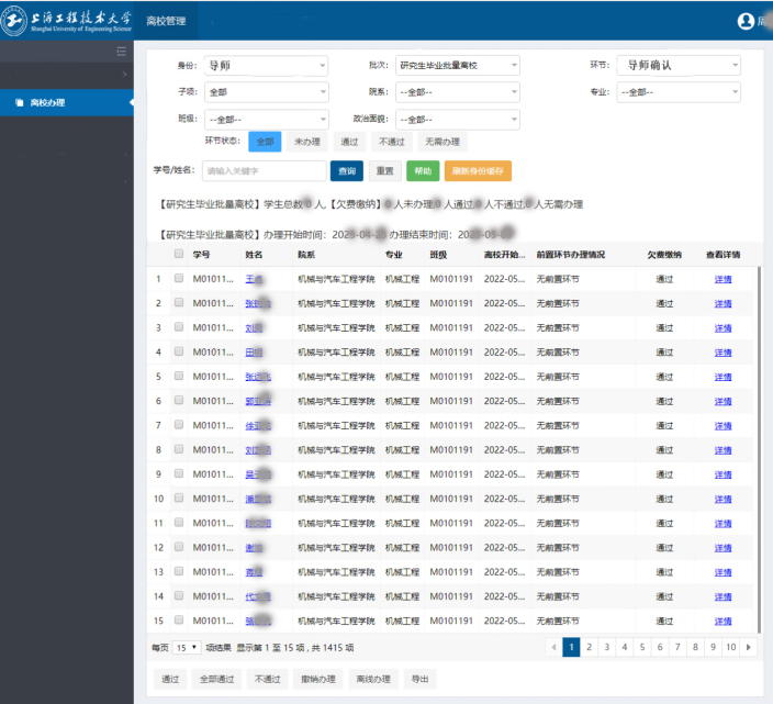 登录综合服务门户,点击“推荐事务”中的“员工离校系统(新)”,打开网页如下图所示,首先选择“批次”为“研究生毕业批量离校”,选中下面列表中的员工,点击最下面的“通过”按钮(有时需要向下划动鼠标才能看到“通过”按钮)。