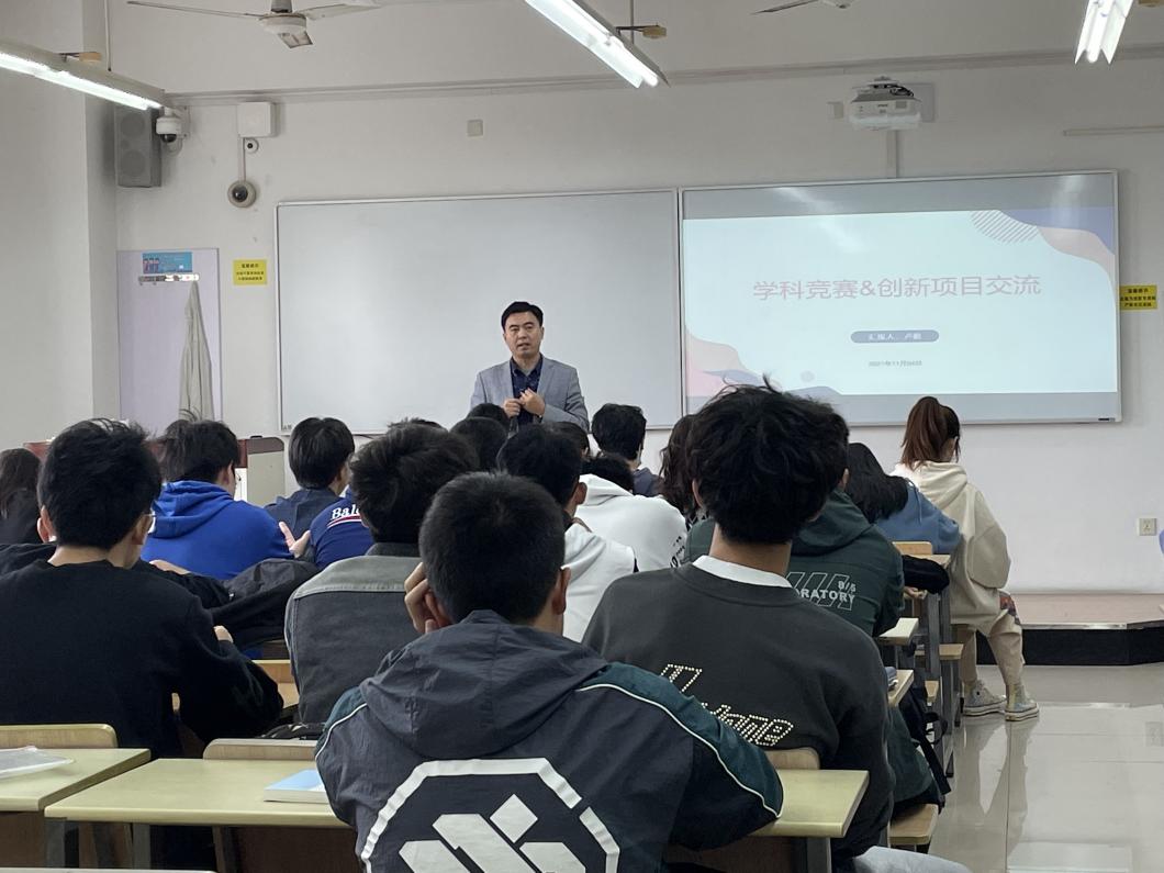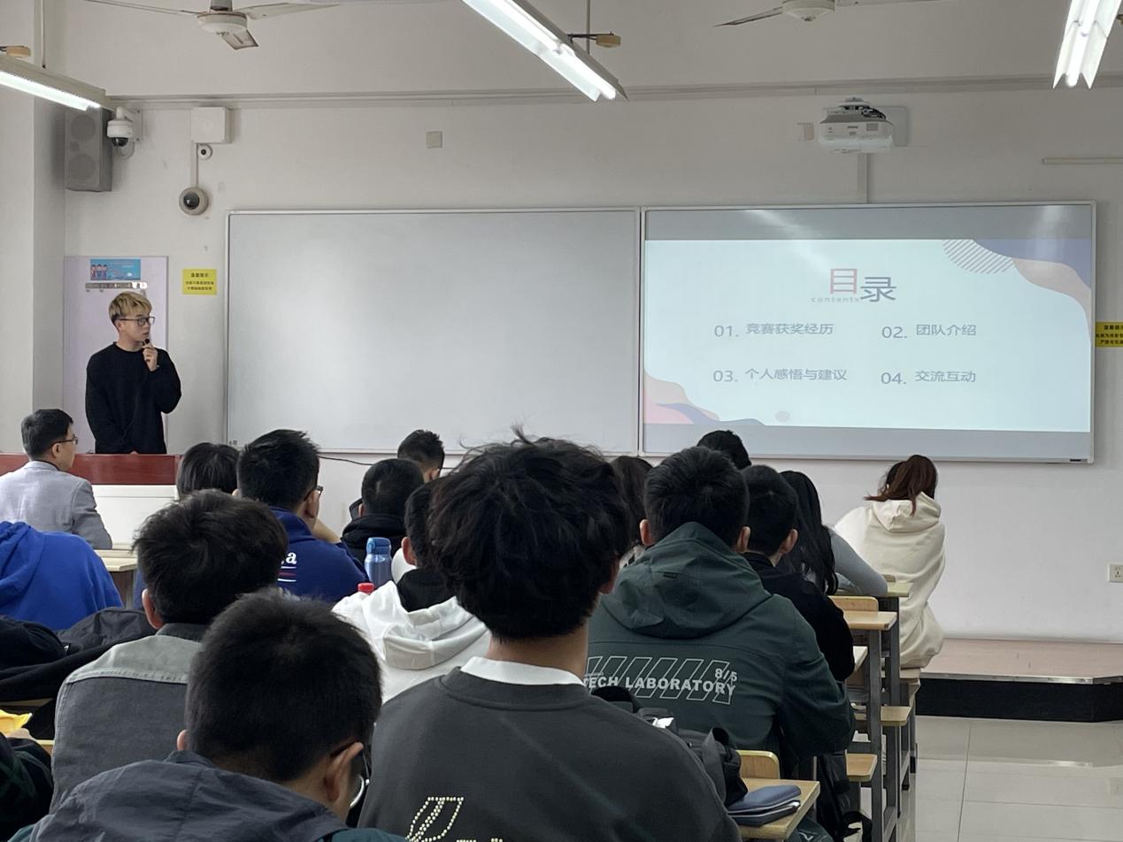 本次分享会秦立国老师邀请老员工创新项目、学科竞赛和创新创业赛事获奖者卢毅同学作为嘉宾,为同生们分享他们的学习、创新和参赛故事。卢毅同学从自己参加竞赛的经历出发,向同学们细致的分享了他们从组队、选题、申请书填报、项目实施和项目答辩各个环节的经历。他特别强调参赛时,团队的构建是非常重要的,要注意优化配置团队组合,建议跨专业、跨学科的组合,这样团队每个成员在比赛中实现的功能也会最大化,每个人的获得感也会增强,并通过自己获奖项目中团队合作的经历进行了分享。同时,卢毅同学鼓励学弟学妹们积极参与各类比赛,不要去担心时间不够,通过比赛可以大大提升个人学习工作的专注力,会让学习和工作效率有很大提升。为了让同学们对竞赛项目有更加直观和形象的认识,卢毅为同学们展示了他们的一个项目在参加竞赛时的商业计划书以及广告宣传视频。在互动环节,同学们就学习安排、团队建设、项目想法等与在座老师和卢毅同学进行了热烈的讨论。