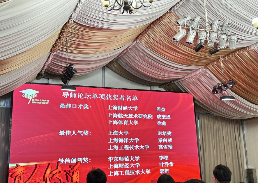 近日,由上海市教育委员会、上海市学位委员会主办,上海市教师教育公司与东方绿舟共同承办的2025年上海高校新聘研究生导师培训班圆满落幕。3044永利集团研究生导师高雪瑞博士在培训期间表现突出,在“育人传道”导师论坛中荣获“最佳人气奖”。