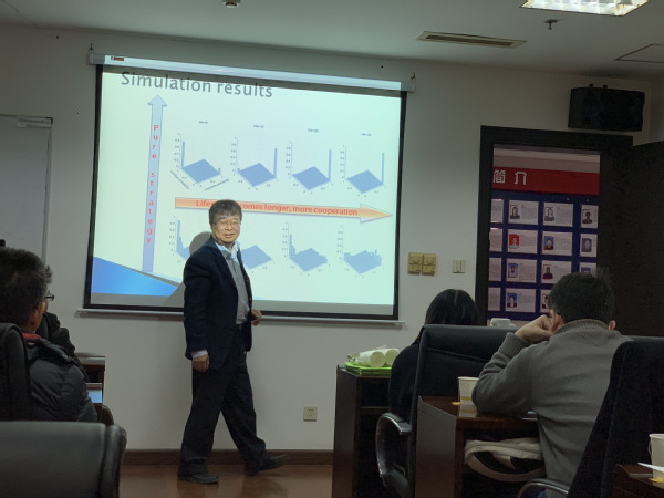 杨晓光研究员首先通过自然界和人类社会中的实例,说明合作现象普遍存在,而且通过不断的进化,合作呈现了复杂多样的表现形式。他认为合作是人类进步的动力,所有的人类奇迹都是合作的结果。接着,杨教授利用博弈论模型详细地解释了合作与分离问题,提出条件分离能够促进合作。然后,杨教授进一步介绍了人类社会的演化过程中的一些分离现象。他认为,分离过程中施加适当的惩罚成本或者惩罚机制有利于促进合作。如何把握分离惩罚的度是需要继续探讨的问题。最后,杨教授就竞争与合作提出自己的一些观点。杨教授幽默风趣的语言及精美的PPT,给大家揭示了生活和社会现象中的数学之美,开阔了大家的视野和思路。报告结束后,杨教授与参加讲座的青年教师和研究生就社会行为研究领域的热点问题做了深入的交流与探讨。