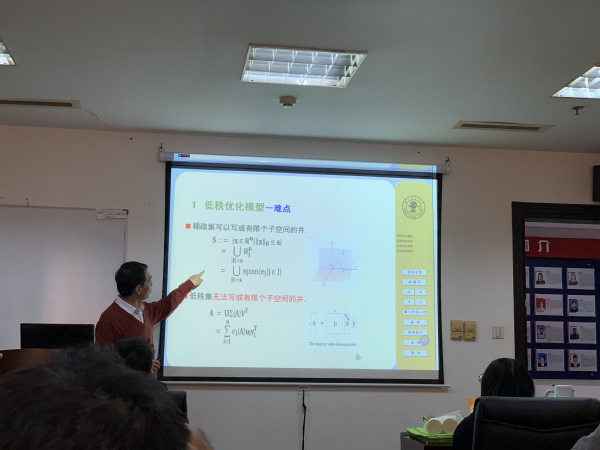 修乃华教授首先介绍了机器学习与最优化问题之间的关系。其次,修教授通过线性推断、降维学习、度量学习、二分类学习、多分类学习、多任务学习和聚类学习等实例引出低秩优化模型,并进一步阐述了该类问题的难点和研究现状。然后,修教授重点介绍了他的课题组在低秩优化领域所取得的最新研究成果,包括秩约束矩阵优化问题的一阶以及二阶最优性条件刻画等。最后,修教授对低秩优化的理论、算法及应用提出一些创新性观点。修教授的报告内容翔实丰富,讲解生动有趣,给广大师生带来了统计优化研究领域的前沿和热点问题,开阔了广大师生的学术视野,使大家受益匪浅。报告结束后,修教授与参加讲座的青年教师和研究生就机器学习领域的热点问题做了深入的交流与探讨。