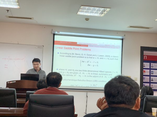 袁晓明教授首先讲述了线性鞍点问题和非线性鞍点问题的背景以及经典求解方法。其次,袁教授重点讲解了求解非线性鞍点问题的一种非精确的Uzawa算法框架及其收敛性分析。接着,袁教授分享了该问题在椭圆型最优控制问题中的应用以及数值算例结果。最后,袁教授就该问题的进一步研究作了探讨和展望。袁教授的报告不仅为广大听众带来了优化领域的最新研究成果,而且丰富了优化的应用领域,开阔了大家的视野和思路。报告结束后,袁教授与参加讲座的青年教师和研究生就最优化领域的国际前沿和热点问题做了深入的交流与探讨。