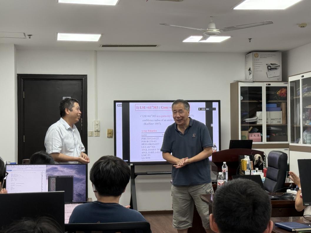 刘庆忠研究员的报告围绕 “微类星体” 这一天体物理热门领域展开,既涵盖基础理论进行科普,又深度分享原创性研究成果,内容层层递进、深入浅出。首先简要梳理微类星体的发现历程与核心性质——一类具有相对论性射电喷流的 X 射线双星。微类星体近 30 余年始终是高能天体物理的研究焦点,尤其近期我国 “拉索”(LHAASO)实验证实其为高能辐射来源及宇宙线加速器,进一步凸显了该领域的科学价值。随后,刘庆忠研究员重点介绍课题组与合作者在微类星体多波段研究中的关键突破:微类星体 LS I+61°303 的多波段性质研究。最后,刘庆忠研究员与参会师生就 “微类星体与宇宙线起源的关联验证”“多波段数据联合分析方法” 等问题展开热烈讨论,并针对大家提出的疑问逐一解答,现场学术氛围浓厚。
