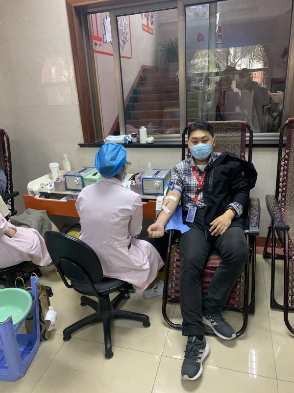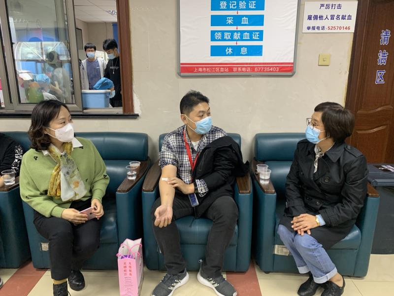 在休息室,校工会李霞副主席和数理外国语联合党委钱慧敏书记看望了刘烨老师,钱惠敏书记问到:“你是第几次献血了?”,刘烨回答说:“我也记不清楚了,我是习惯性献血,今年我们国家受疫情影响,血站一直处于用血告急状态,今天能再来献血,真的感觉到是责任的兑现和爱心的奉献,也看到这么多同学热情的献血,他们的奉献让中国更加的健康,他们的精神让中国更加强大!”
