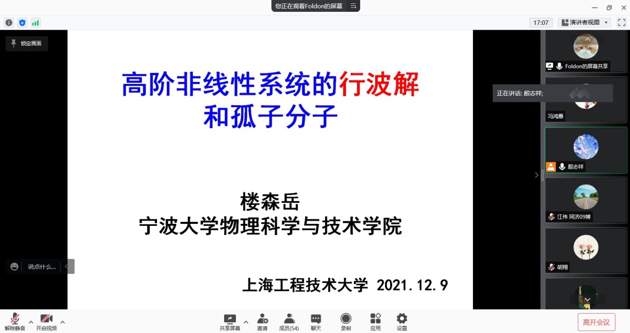 为进一步提升公司科研创新能力和开展有组织科研活动,更好的把握可积系统与高阶偏微分方程孤子理论的前沿动态,宁波大学物理科学与技术公司博士生导师楼森岳教授受邀于12月9日在线作题为“高阶非线性系统的行波解和孤子分子”的学术报告。报告会由殷志祥经理主持,公司教师与研究生共计100余人参加。