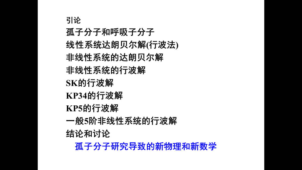 楼森岳教授结合自己近年来的科研经历以及多年来于可积系统方向研究的宝贵经验,首先介绍了各类实验中发现的孤子分子现象,说明了该理论的实际背景与广泛的物理应用。之后,以高阶NLS方程、SK方程、KP34方程与KP5方程为实例,具体介绍了这些方程中存在的孤子分子现象,着重阐述了这些不可直接通过行波变换与积分法得到的特殊形式的孤子解。在讲座中,楼教授强调目前这些解虽然可以利用双线性方法构造出来,但是对应着动力系统中何种轨道问题仍有待研究,据此总结了孤子分子与行波理论中存在的大量亟待解决的开问题。