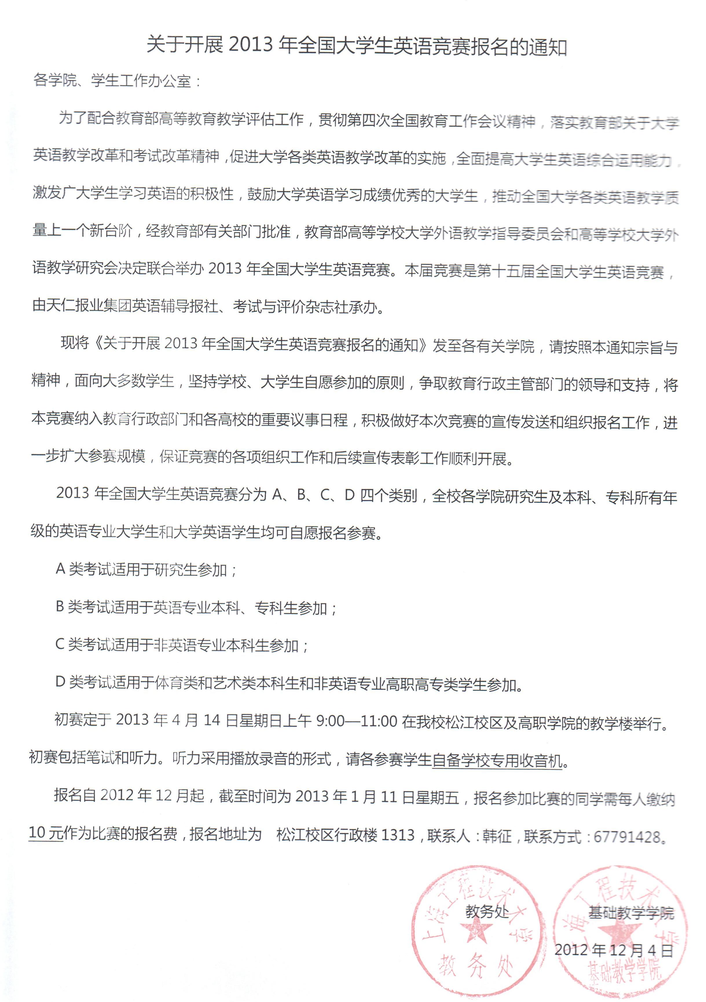 报名自2012年12月起,截至时间为2013年1月11日星期五,报名参加比赛的同学需每人缴纳10元作为比赛的报名费,报名地址为 松江校区行政楼1313,联系人:韩征,联系方式:67791428。