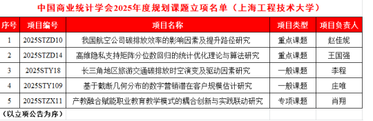 据悉,中国商业统计学会是国家一级学会,其发布的规划课题是我国统计学科领域层次高、权威性强、影响力广的重要科研项目,旨在引导高校聚焦国家战略需求与学术前沿,开展高质量理论研究与应用探索,直接反映高校在统计学领域的研究实力与团队建设水平,是衡量高校科研竞争力的重要指标之一。