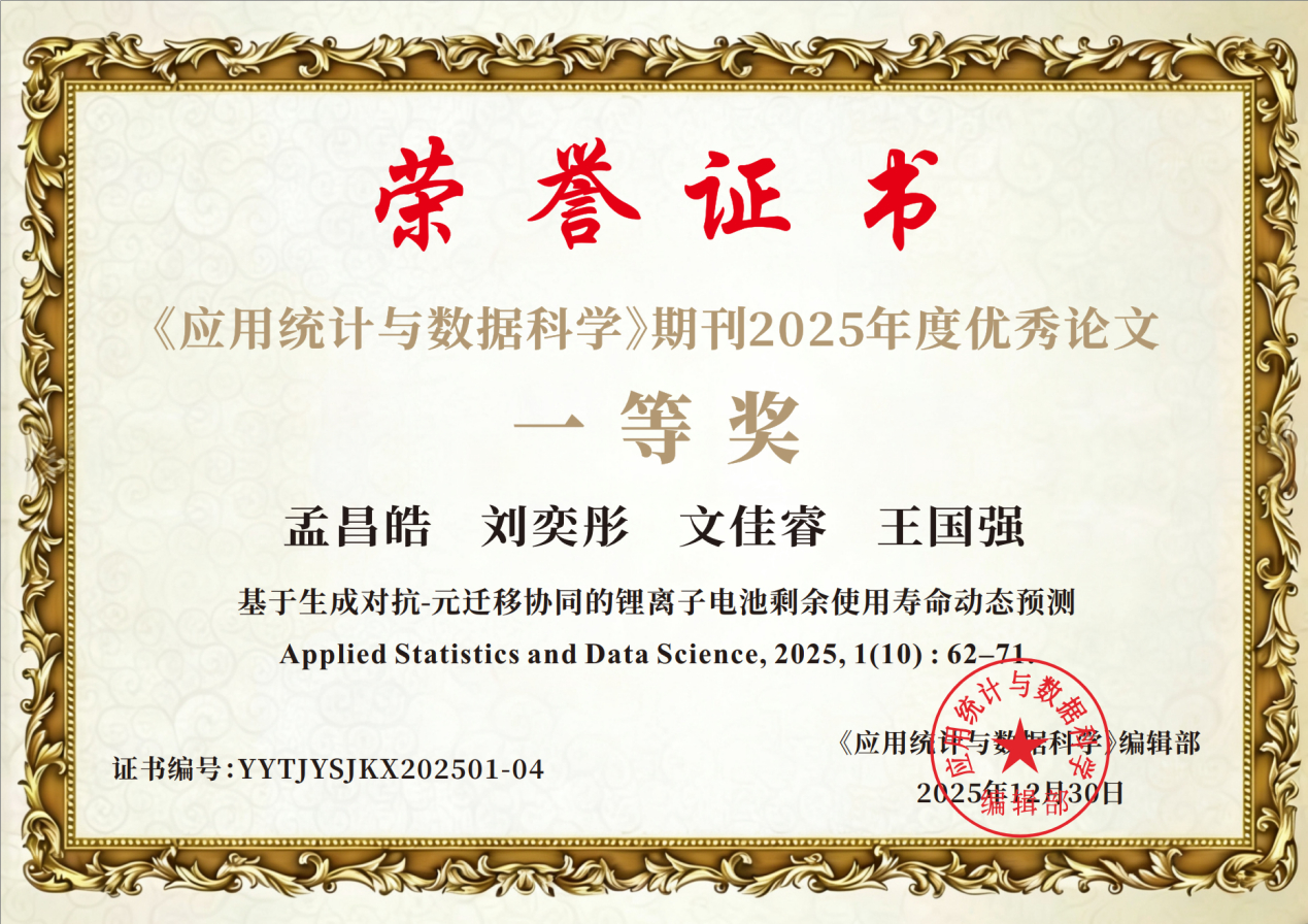 近日,《应用统计与数据科学》编辑部公布2025年度优秀论文评选结果。3044永利集团数据计算及应用专业本科生孟昌皓作为第一作者,在王国强教授指导下完成的论文《基于生成对抗-元迁移协同的锂离子电池剩余使用寿命动态预测》荣获2025年度优秀论文一等奖。该成果为本年度一等奖中,唯一一篇由本科生担任第一作者的论文。