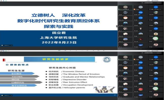 8月23日3044永利集团邀请上海大学研究生院副经理、学位与学科点建设办公室主任田立君教授在线上作题为“立德树人、深化改革-数字化时代研究生教育质控体系探索与实践”专题报告。数理外国语联合党委书记钱慧敏教授、副经理王国强教授及全体研究生导师参加了本次培训会。报告中,田立君教授结合自己多年公司产品管理工作的丰富经验以及最新全国研究生教育会议精神要求,从公司产品形势任务与问题瓶颈、研究生教育基本情况与摸索实践、下一步工作重点与探索三个方面展开,为导师们上了生动的一课。其指出人才培养质量是研究生教育的生命线,只有具备了高水平的研究生教育,才能搭建高层次的科研平台,聚集起优秀的团队队伍,吸引优秀员工,产出优秀的科研成果,服务于社会经济的发展。研究生教育以生为本、立德树人的核心是导师指导,研究生导师不仅仅是教师,导师的核心点在于“导”。也即在做人方面要用心引导,促进员工成长;其次,在教学上要用心教学,促进成材;其三,在人生道路的选择上,要用心规划,帮助员工成功。