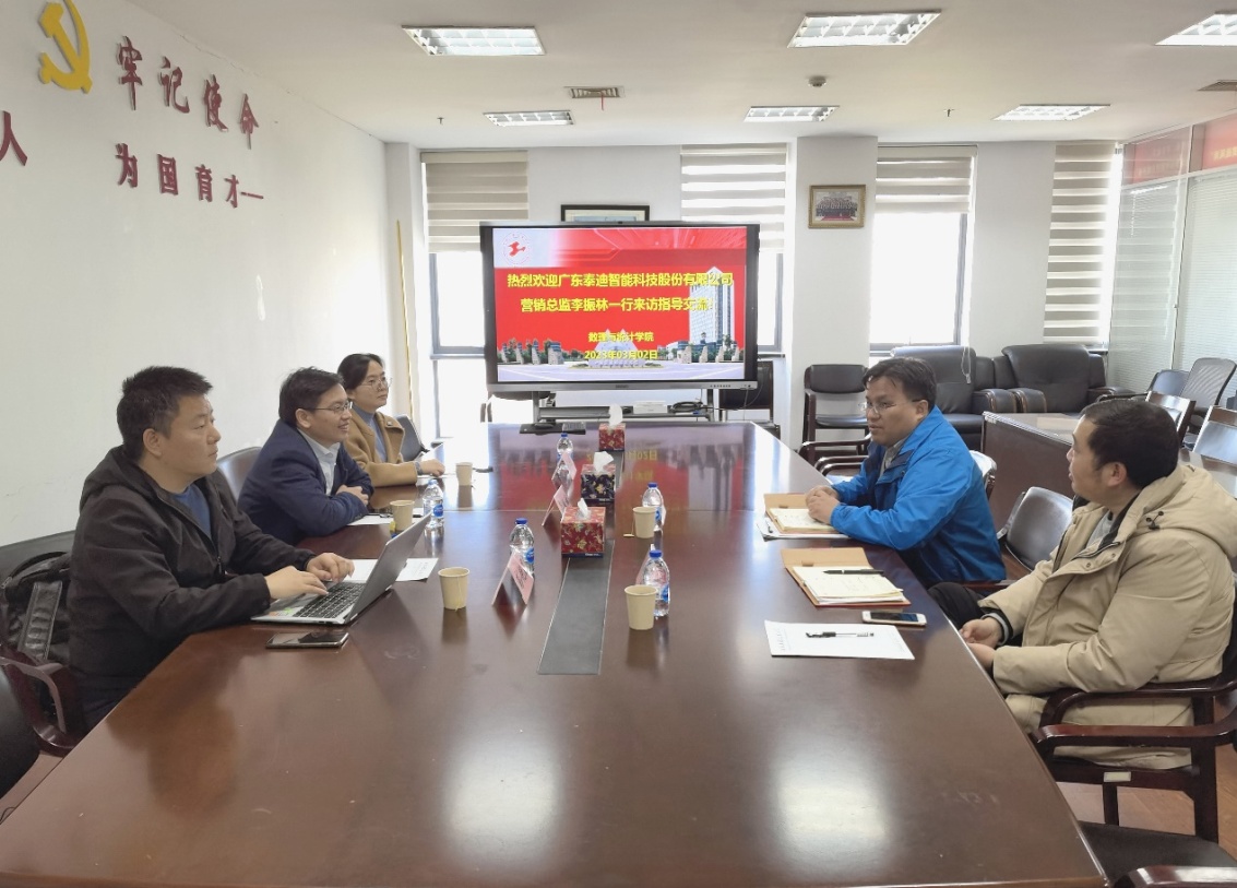 为进一步推动产教融合,3月2日上午,广东泰迪智能科技股份有限公司营销总监李振林、战略发展中心负责人张尚佳、泰迪智能科技(上海)有限公司总经理彭艳昆一行受公司邀请,来校调研交流,洽谈校企合作等事宜。公司王国强经理、统计与数据计算系郑中团出席副主任参加交流。