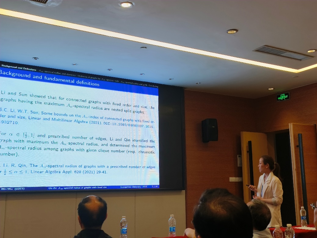 5月19日至21日,公司青年教师魏薇参加了“2023广州代数图论及其应用研讨会”,并于20日下午做了题为“On the Aα-spectral radius of graphs with fixed size”的学术报告,分享了Aα矩阵中Brualdi-Hoffman型问题的最新研究成果。此次会议不仅拓展了与会人员对代数图论的发展现状及前沿问题的了解,还加强了公司公司青年教师与国内知名专家学者之间的学术交流。