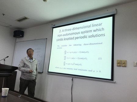 李教授首先介绍了什么是扭结以及(m,n)- 环面扭结,然后逐一介绍了能产生扭结周期解的三维线性非自治系统、二次系统以及三次系统,对这些产生扭结周期解的三维系统,给出了扭结周期解和同宿轨到的精确的参数表达式。这次学术交流活动,为从事微分方程和动力系统相关专业的老师们提供了一个很好的学习机会,开拓了研究视野。
