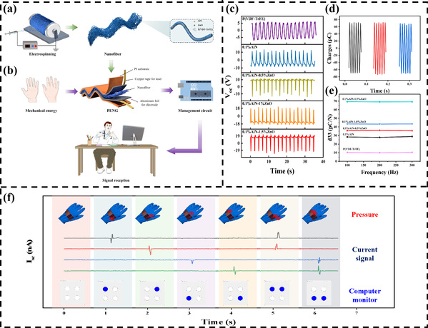 该研究通过静电纺丝方法在高转速1500 rpm下制备了ZnO和AlN共同掺杂P(VDF-TrFE)的纳米纤维,复合薄膜感应出最大电荷为138 pC,P(VDF-TrFE)/AlN/ZnO压电纳米发电机开路电压(Voc)为46 V,短路电流(Isc)为130 nA,与其他类型的压电纳米发电机相比具有显著优势。同时,该工作提出了一种基于P(VDF-TrFE)/AlN/ZnO 薄膜的手势识别传感器原型器件,通过识别不同手指姿势的信号特征来监测人体的运动和行为,应用于智能健康监测系统,该研究对于含氟聚合物铁电极性结构在未来柔性便携式器件的新应用具有重要的科学研究价值。