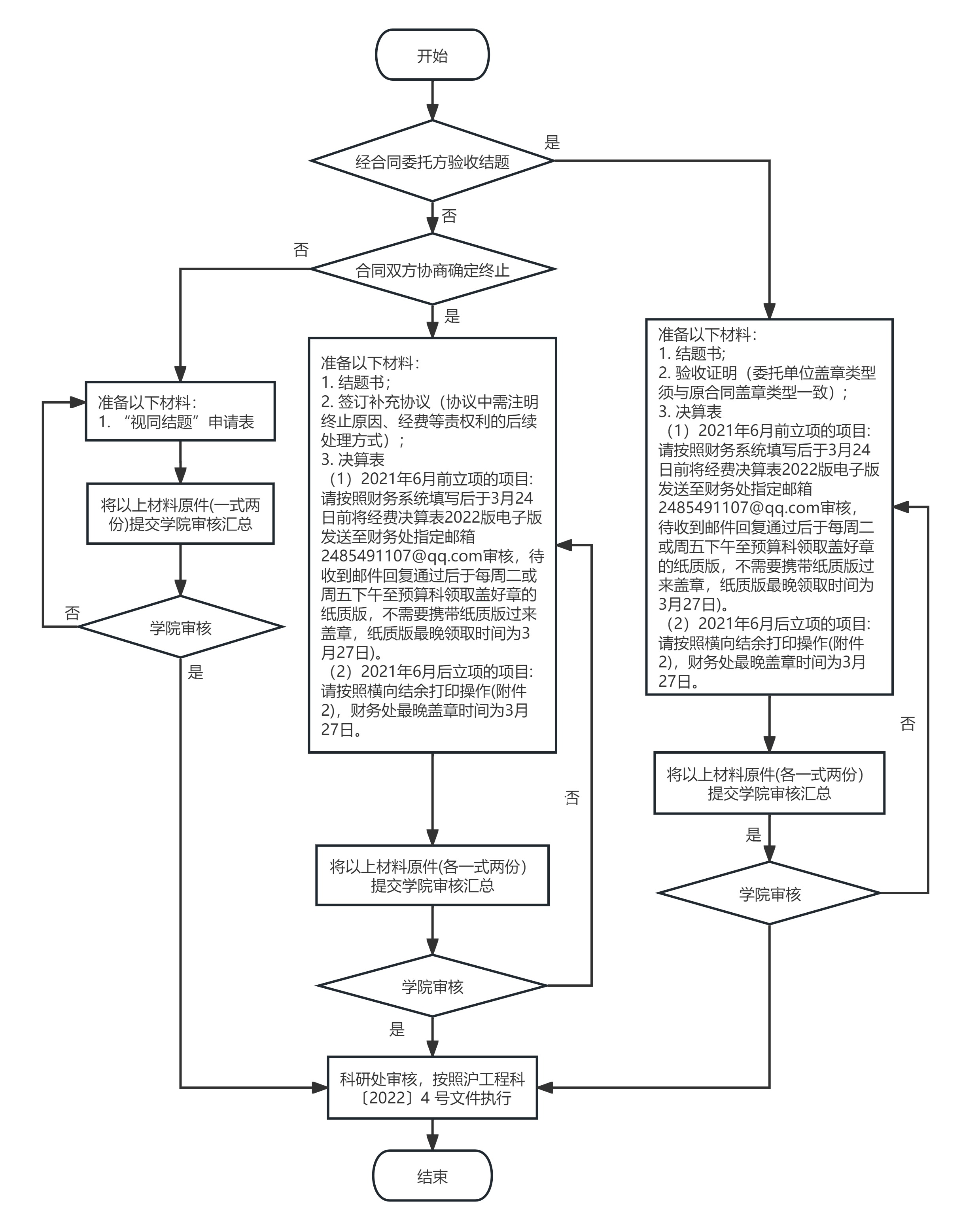 各相关项目负责人应在受理期间提交项目结题、项目终止或“视同结题”申请,相关结题材料(2022版请至“服务门户-科研业务申请-横向科研项目结题”业务中下载)请提交科研秘书,公司审核汇总后于2025年3月31日16:00前提交科研处。逾期未办理的结余经费将予以冻结。具体流程详见业务流程图(附图1)。